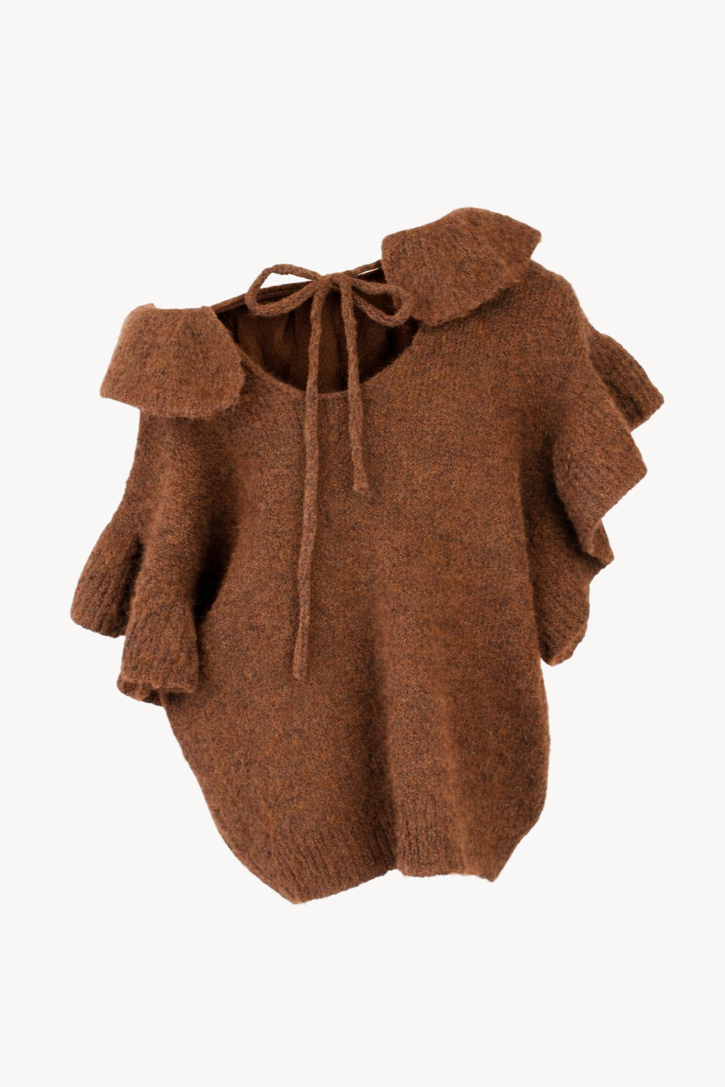 Puha, meleg, gyapjúhatású kötött felső romantikus fodros részletekkel. A lazább szabás és a meleg tónus kényelmes, mégis nőies hangulatot teremt. Ideális hűvösebb napokra, casual elegáns viselethez vagy rétegezéshez.